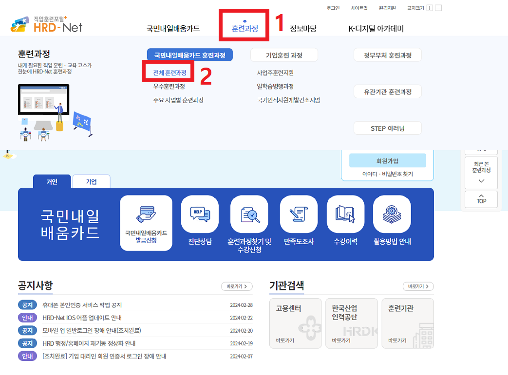 1. HRD-Net에 접속합니다. 훈련과정 - 전체훈련과정 클릭합니다.